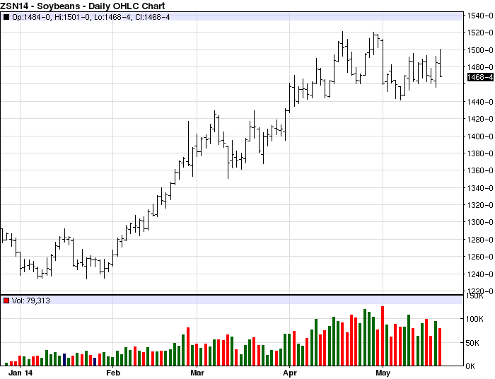 May 20, 2014 ".........The double top of $15.20 on April 17 and 29 are likely a very important turn. That price is the exact midpoint of the all time high of $17.95 made in September 2012 and the lowest point since which was $12.43 on August 7, 2013.......... There is a very good possibility that July beans will have a severe downtrend starting any day........... At some point very soon I expect it to turn lower for good."